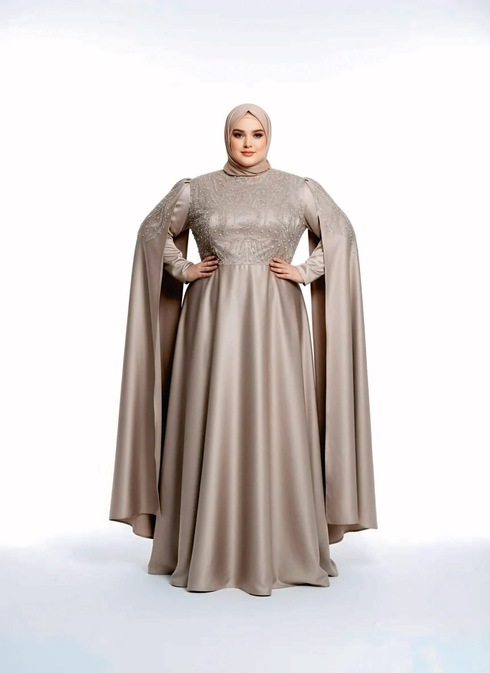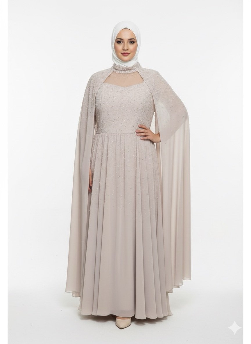 Nude Formal Modest Evening Dress with High Neck Cape